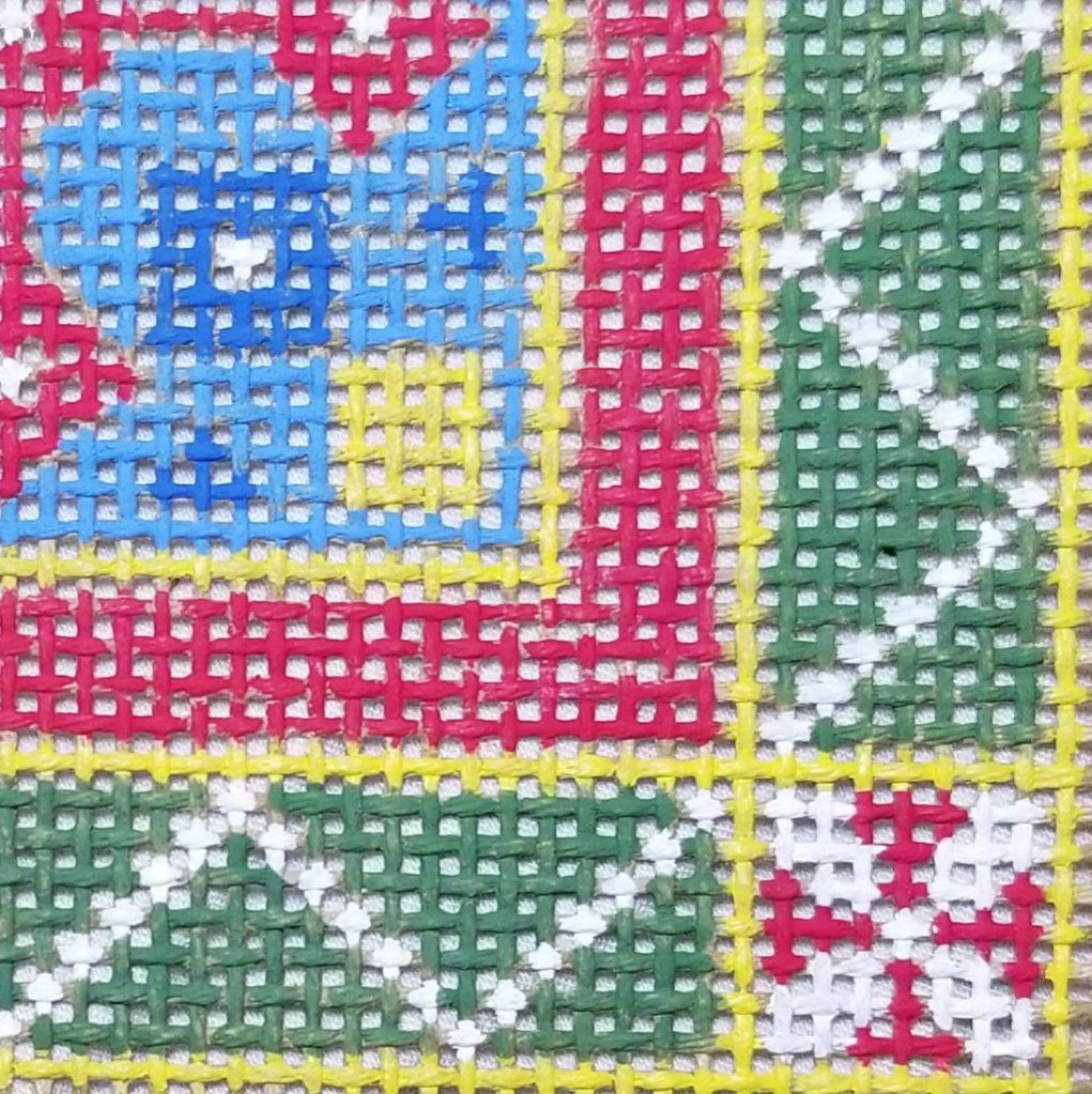 As I said, I pulled out some 18 count graph paper and transferred the design there. It’s still the same size (4″x4″). But, I was able to get more details on the 18 count tan canvas particularly in the border because there are more canvas threads. It took longer (3 & 1/2 hours) to paint (again, with breaks).