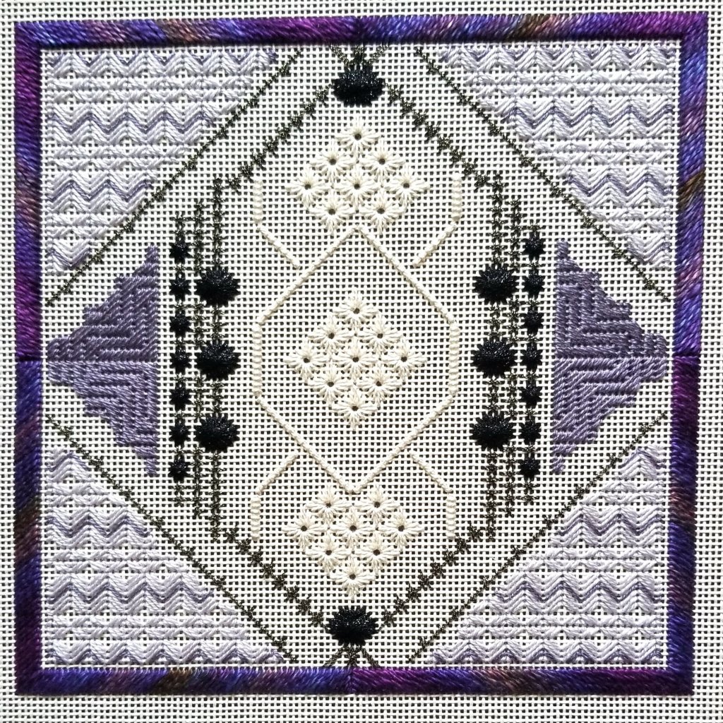 I switched the canvas color and threads from lilac to yellow and blue. My stash came through nicely with threads including Waterlilies 017 Blue Lavender (instead of Gloriana), ThreadworX 710161 (which was a little heavier than Kreinik #4 but worked well), Kreinik Petite Facets 014, Neon Ray’s N98 (rather than Panache which I had in the correct color but hated working with it), Silk Lame Braid Petite SP174 (instead of Treasure Braid), and Sundance Beads Size 11 Color 356.