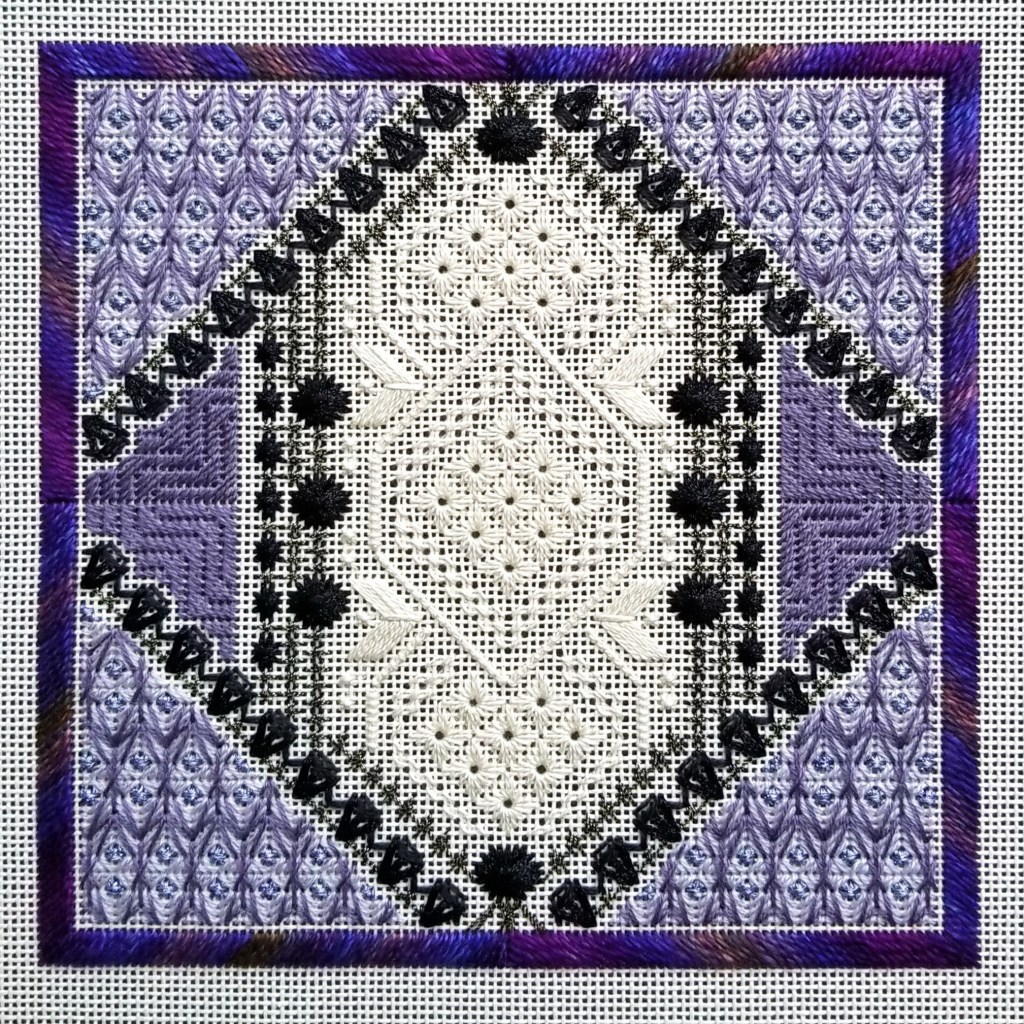 This is the 4th piece of the Downton Abbey series by Gay Ann Rogers. I worked on the overstitching with the darker plum Impressions in the corners of the Scotch stitch variation yesterday at our ANG Main Line Stitchers chapter Stitch-in. Due to Thanksgiving next weekend, we moved it to a week earlier than usual. Robin was a most generous host with a great soup and chicken salad lunch and brownies made by Pat. Last night, I finished the overstitching and filled in the Smyrna stitches. This morning, I finished the overstitching on the long diagonal chains with black Kreinik 1/16 Ribbon. I love it!