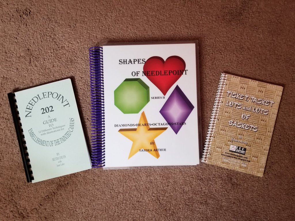 Filed under: Books in My Library, Needlepoint 202 by Ruth Dilts, Needlepoint Books, Shapes of Needlepoint Circles, Squares, Triangles, Rectangles - Series I by Sandra Arthur, Shapes of Needlepoint Corners, Hexagrams, Ovals, Parallelograms - Series III by Sandra Arthur, Shapes of Needlepoint Diagonals, Horizontals, Verticals - Series IV by Sandra Arthur, Shapes of Needlepoint Diamonds, Hearts, Octagons, and Stars - Series II by Sandra Arthur, Tisket, Tasket, Lots and Lost of Baskets by Sandra Arthur