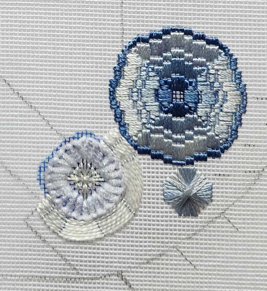We are not going in the order Lois did so we have the background to stitch over the long winter months. I am very happy that Lisa, a chapter member, agreed to lead the project. I’ve wanted to do this for awhile. This month we stitched the Smyrna Cross Eyelet Combination that sits inside the Circular Buttonhole. I did use the dark Copic marker underneath but since I didn’t want the canvas to show through, I used Lois’ suggestion to place spokes in a circle first and then the buttonhole stitches. The spokes really helped me keep the buttonhole stitches even going around in a circle. If I were to do it again, I might use a thinner thread for the spokes to allow more of the blue to show through. Petite Frosty Rays provided almost full coverage.