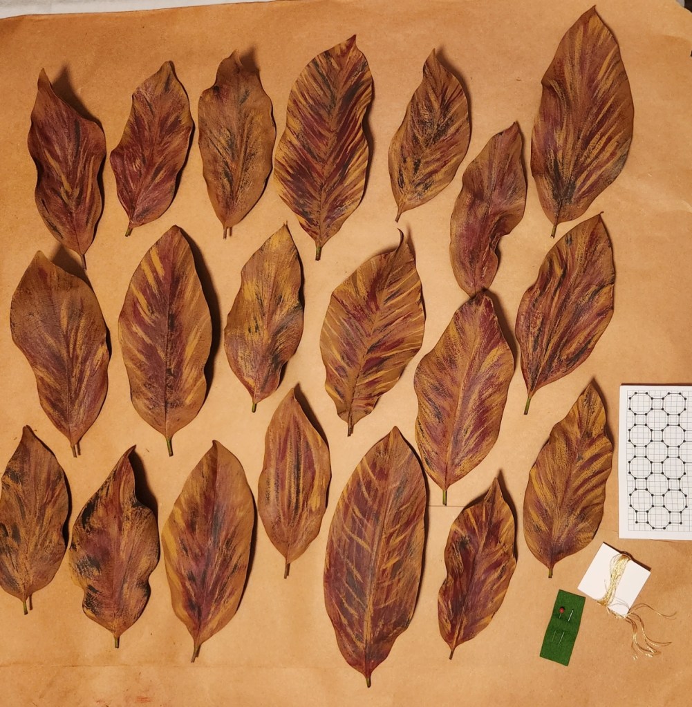After I got the correct acrylic paint (do not use acrylic textile paint on anything other than fabric), I painted Magnolia leaves for members of the Needlework and Fiber Guild of Media. Much better.
