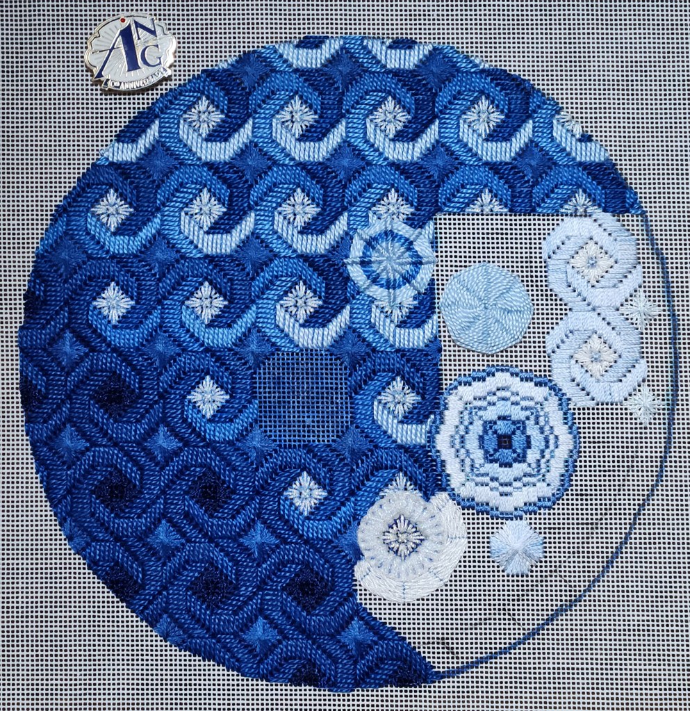 I’m finally getting back to Circles: Theme & Variations by Lois Kershner, the ANG 2008 Stitch of the Month. A few of my ANG Main Line Stitchers chapter members are stitching this too. I expanded the diameter to about 8″ to use as a cover for the white wicker basket I made a few weeks ago.