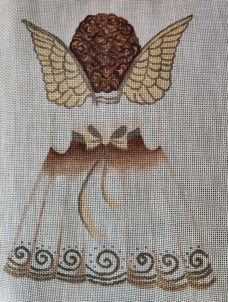 The angel came to me partially stitched belonging to a woman who started it 40 years ago. We met, and I have taken it on as my first stitch for hire project. Why? She is very nice, trying to establish a work-life balance, and can’t fit this in. And I don’t have a basketweave project to work on now. As soon as I agreed, she said she felt lighter. She did an excellent job on what she already did. She used 6 stranded DMC floss as is (not laying the thread). So, I will do likewise.