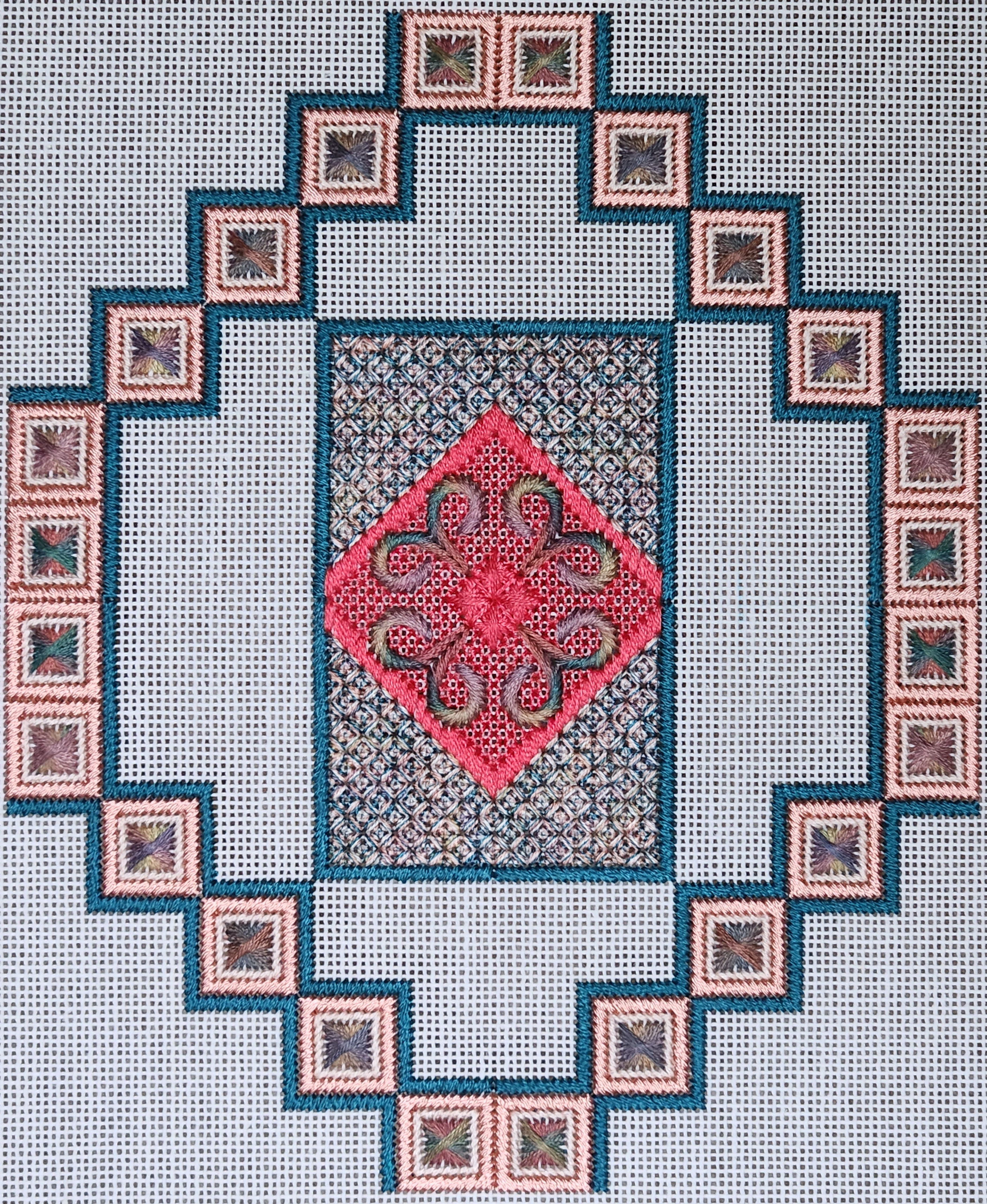 All the slanted gobelin stitches surrounding the Square Rhodes in the 4 quadrants are pointing to the center as well. So I wouldn’t forget the slant while talking at our Saturday Stitch-in, I had already started with the inner most over one stitch and the over 2 with Neon Rays in some of each quadrant. I did have to take my curling iron – a must when working with Neon Rays. But, no mistakes. Not a very exciting portion to stitch, but it was a rainy weekend here, and I finished it. Yes, the north, south, east, and west sides are purposely not closed in.