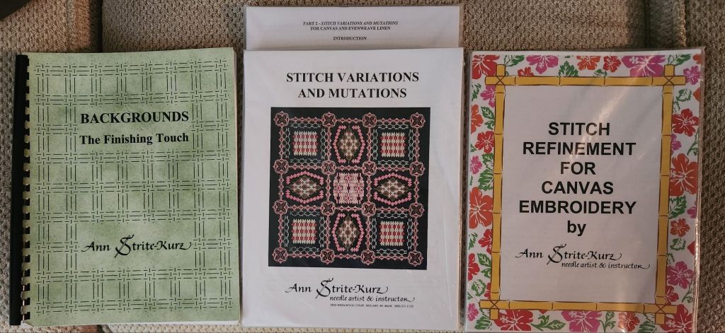 It made me think to look at Ann’s website again to see what other books she has. I already had her Potpourri of Pattern Encore when I started the Master Craftsman program. That’s when I got her Diaper Pattern and Applique books to expand my knowledge of those areas before tackling those steps. All her books have been so thorough. I also obtained Stitch Variations and Mutations, Parts 1 and 2 and Stitch Refinement for Canvas Embroidery (which replaces the older book, The Science of Canvas Embroidery). I could use 6 more weeks of winter to read these books!