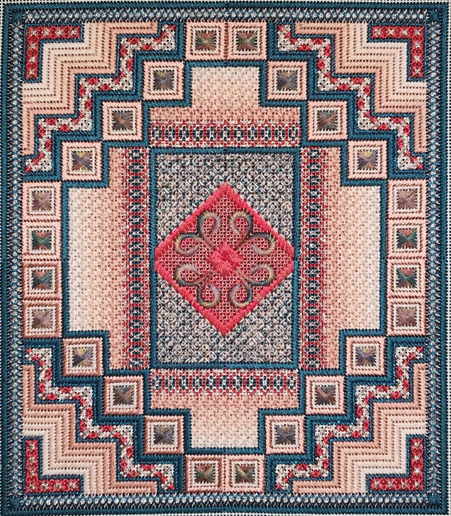 I finished the border Monday but got sidetracked and forgot to post this. I’m very happy with how this turned out. Thanks again to Linda for leading us through the project and picking threads which is key to getting the motifs to show.