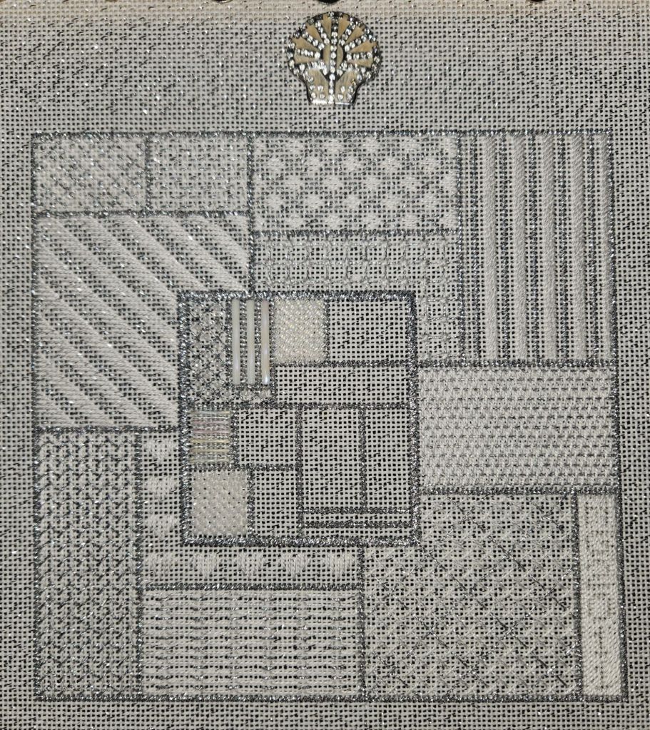 I began Stitches in Sterling by Nancy Cucci in September 2011 when I did the pre-work (silver Kreinik grid) for a class in Rehoboth Beach, DE, with the ANG DE Seashore Chapter. I enjoyed the class. Lori, Patrick, Betsy, and I (all from ANG Main Line Stitchers chapter) took the class. During the 2 days, we got a lot done. I didn’t get more done until now.