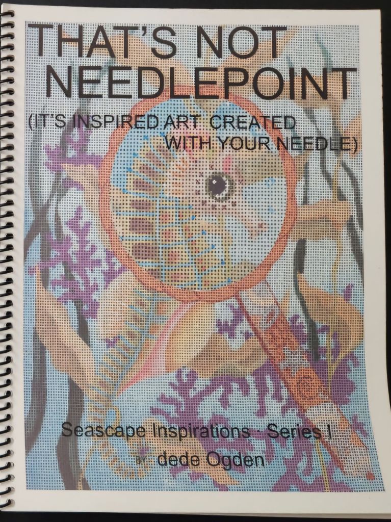 I did post previously about the other booklet, That’s Not Needlepoint (It’s Inspired Art Created with Your Needle), which is by dede Ogden (2011) and represented by Fleur de Paris, Inc. It’s not intended to be complete charts or diagrams to finish the various painted canvases but to offer suggestions for types of elements found in seascapes. The first canvas discussed is Seahorse Spyglass 18073 and is still available (and so is a stitch guide by Tony Minieri). Other canvases discussed are still available from a variety of sources including Undersea Fish 1373, Glass Aquarium Tropicals Green Fish 18015, Glass Aquarium Tropicals Blue Fish 18034, Undersea Garden 1378, Seahorse Pillow 18056, and Enchanted Mermaid Dream 18050.