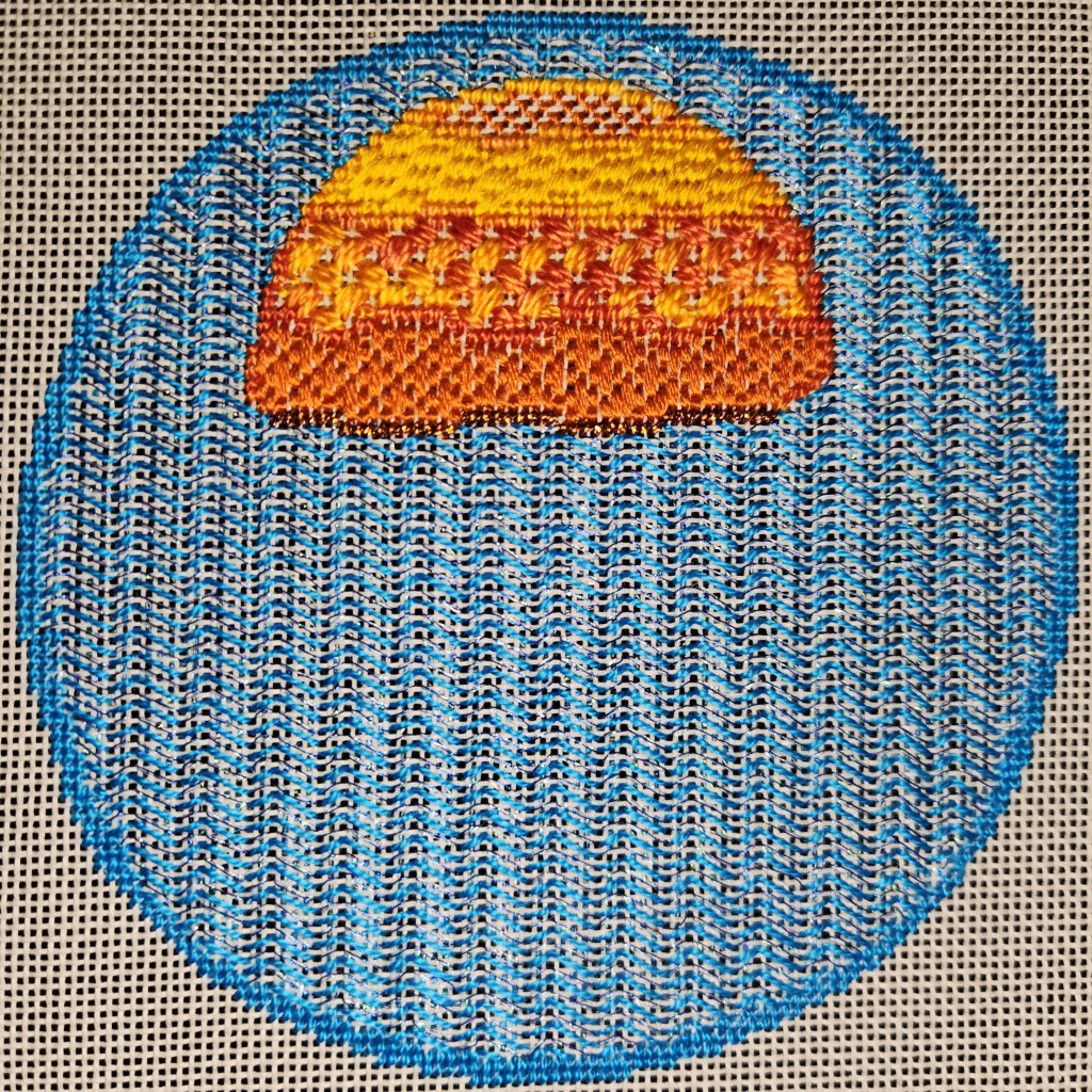The tent stitch is small, and so it recedes for a good background stitch. And the paint shows through. I used Watercolours 234 Celestial Blue, which has some color change but not a whole lot.
