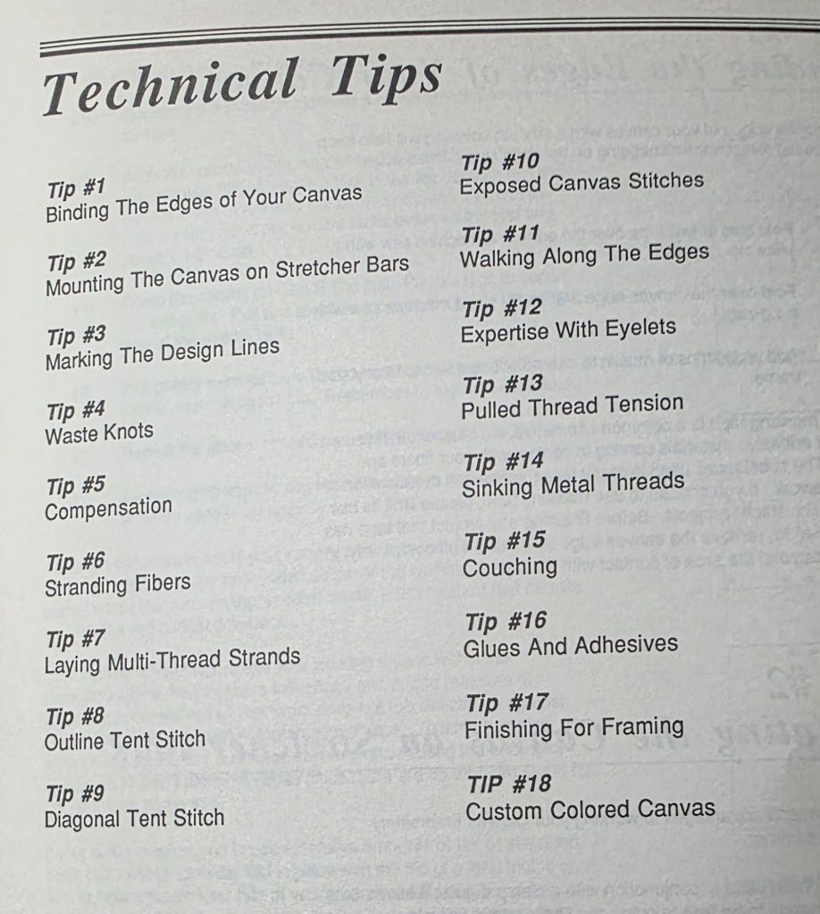 It’s technically not a “needlepoint book” as you can see from the Table of Contents because it has 11 projects. But, I gleaned some interesting things from it. Ruth Cameron explains how to use one color of stranded threads to create depth and contrast. Mary Anderson diagrams Smyrna Cross Variations. Susan Porter created an interesting Mosaic Border with a Running Stitch Accent. That’s what popped out on the first pass through the booklet.
