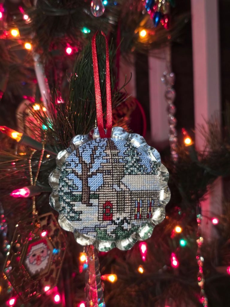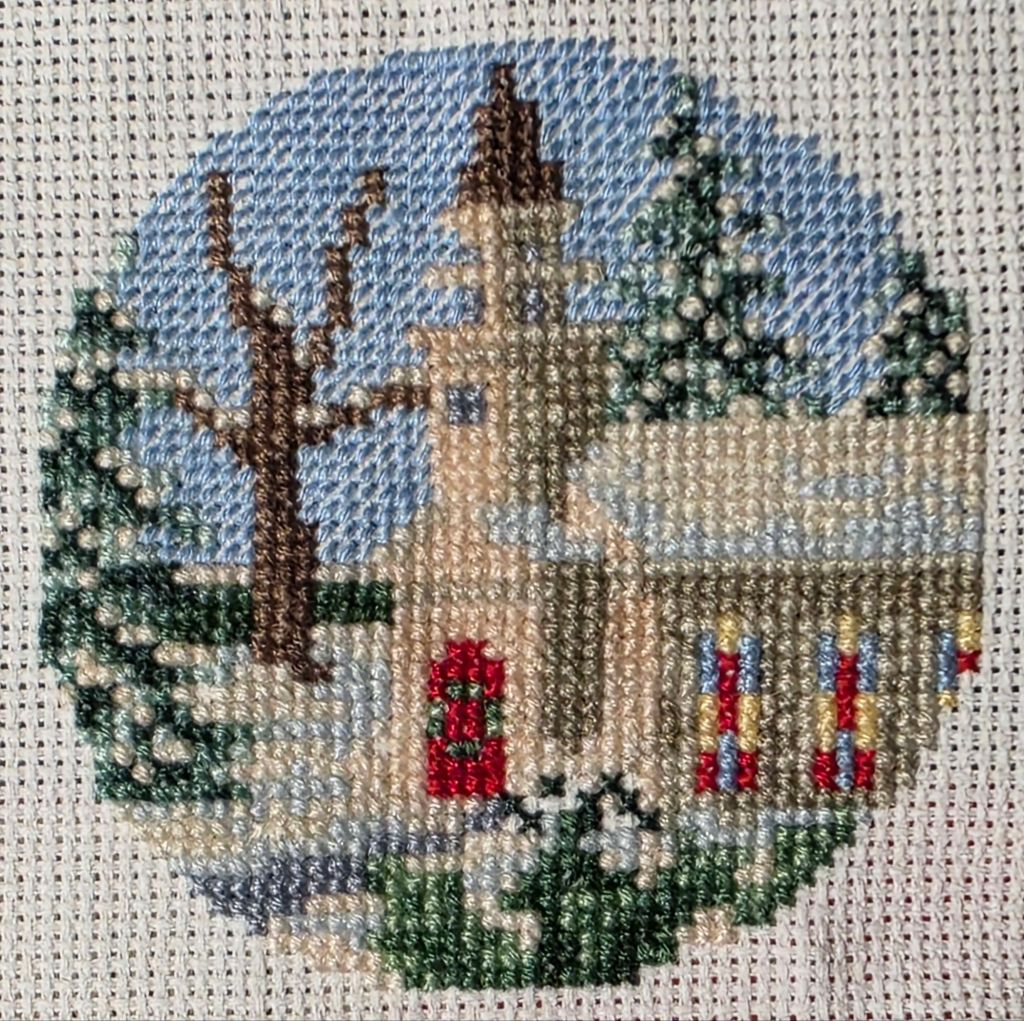 This church ornament by Cross My Heart, Inc was a destashed item from Sally that I took out to have a small piece to work on periodically. The company is still online at EverythingCrossStitch(.com) but this kit is from 1992 and no longer available.