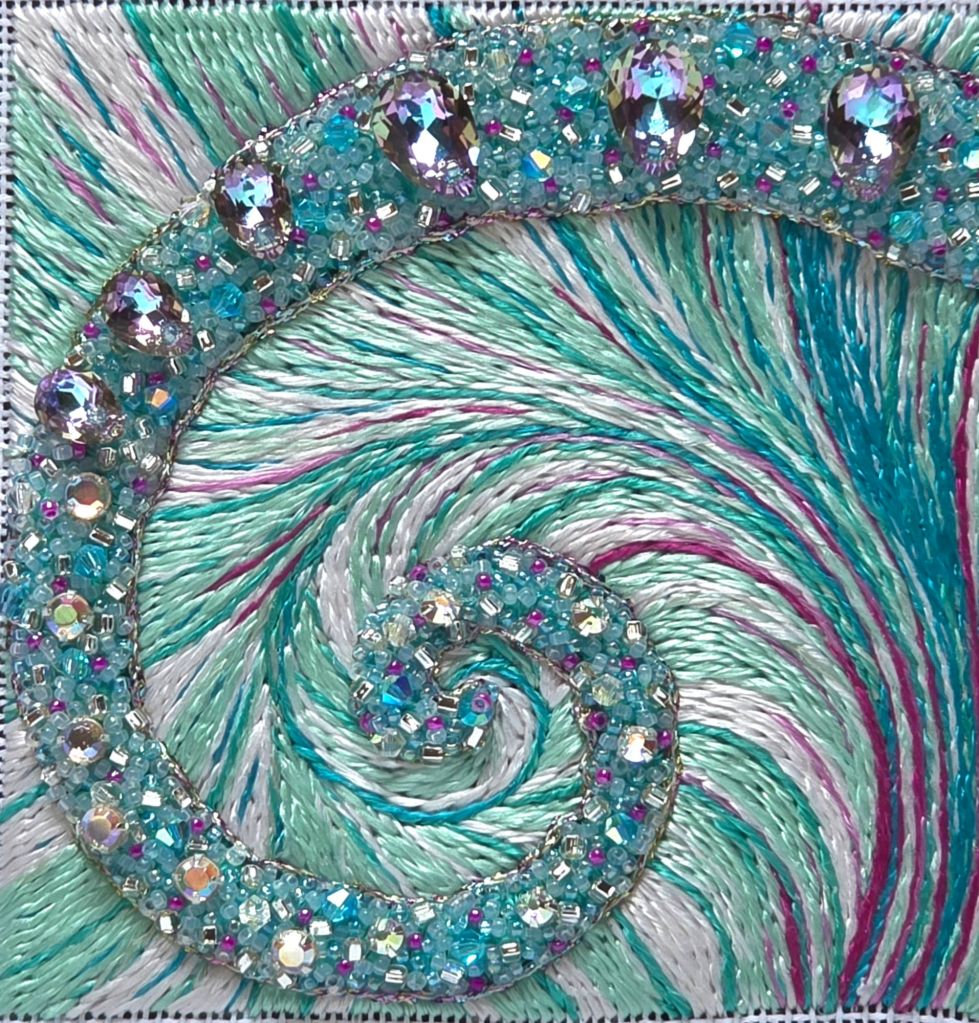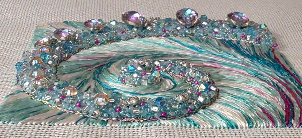 There were 9 bags of montees, pears, seed beads, rocailles, and bicones in the Nautilus kit by Kay Stanis. This didn’t get done in one sitting because working with 2 strands of invisible thread (supplied by Kay) was not easy either. This took alot of beads!