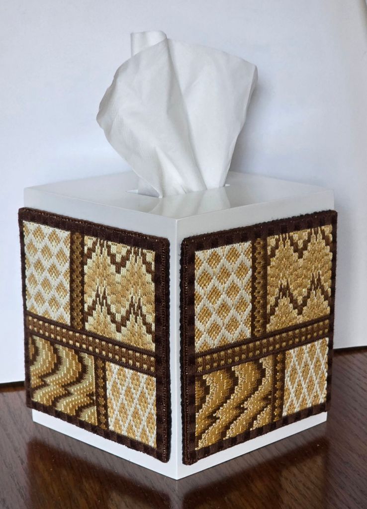 I used a few stitched designs to adorn tissue boxes this year. In the September-October 2022 issue of Needle Pointers, I stitched two Bargello Samplers designed by Gail Stafford once in stranded threads and again in sparkly threads. I added a binding stitch border as I attached a black felt backing (with a piece of magazine board for stiffness) and attached it with strips of a double stick archival tape. It went as a 2-sided tissue box for a Christmas gift for my brother John and sister-in-law Sher. Eventually, they may get something in browns and golds for the other two sides so they can rotate it periodically.
