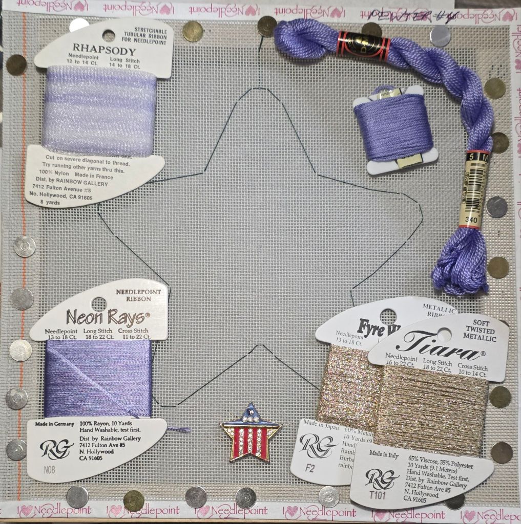 Hope is supposed to be on a gray canvas using Rhapsody R04. My canvas is called pewter, a type of gray that looks great with this Rhapsody. Although my card of Rhapsody is not numbered, it goes great with Neon Rays N08 which is in Susan’s original colorway. I am switching out Anchor Floss and Pearl #5 for DMC threads.