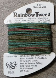 Oops! I was missing Rainbow Tweed RT66 and was going to figure out what to use when I got there but I just found it in a bag of threads I inherited from Mary’s stash (member of Needlework and Fiber Guild of Media)! Thanks Mary.