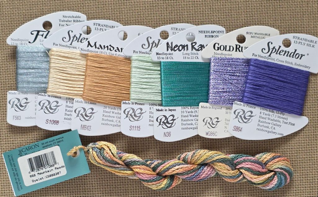 Once I got home with the threads, I pulled out my stash of Watercolours and found 088 Mountain Meadow that should substitute for the Overture V114 which is a retired color consisting of greens, yellows, and peaches. Mountain Meadow also has some pinks which I can cut out or nor depending on where it is going.