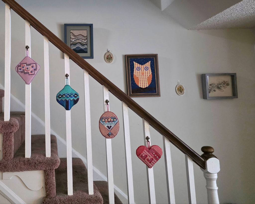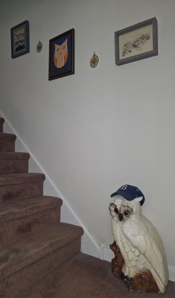 In the background, currently, two Dawn Donnelly pieces flank my owl which Bill loves! And, the owl has a buddy (gifted to Bill many years ago from the ladies in his Binks office)! I rotate among different pieces on the staircase.