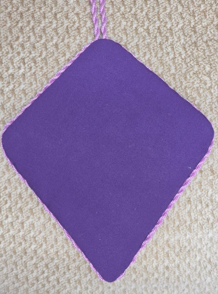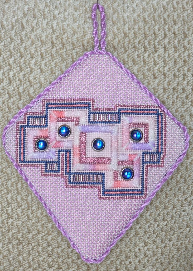 I’d had no luck finding fabric at any Michael’s recently. Initially, when JoAnn’s closed, it looked like Michael’s were stepping it up on the fabrics. But, they didn’t restock. So, when I found fat quarters (18″ x 21″) at Walmart awhile ago, I grabbed a few solid colors including the purple (solid pansy) on the back of this one. It’s a pink canvas but the one long light thread that was couched in the piece is a light purple.