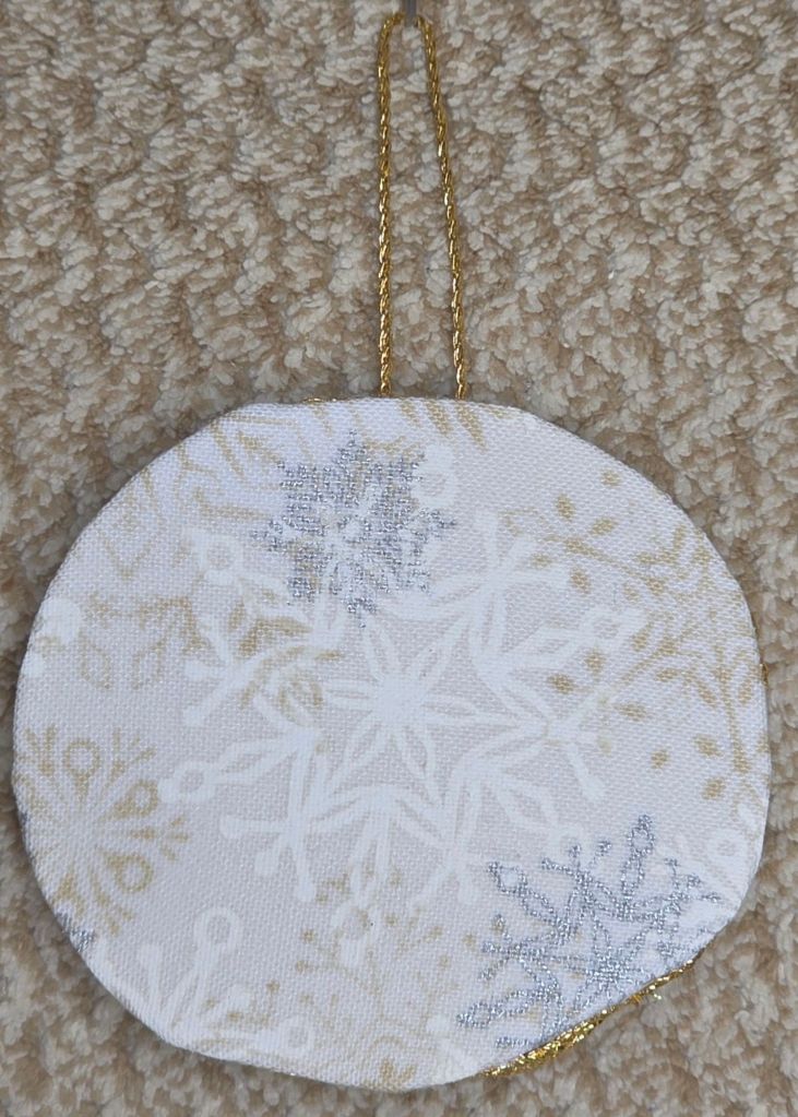 Here I used a wintery fabric with white, silver, and gold snowflakes for this Christmas Ball. I centered a large white snowflake on the back.