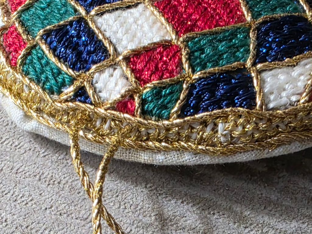 Working on a smaller piece isn’t easier! The ornament wasn’t exactly round to start with. I’d basketweaved aound the outer edge and had already stitched the outer gold ring thinking the cording would cover any irregularities but the cording is thin. One pucker is showing. I do like the loop which was stitched through the basketweave. I like the basketweave showing around the edge. But, the edges are a tad wavy. Overall, this one is ok but not as good as others. From the front, to most people, it’ll look just fine!