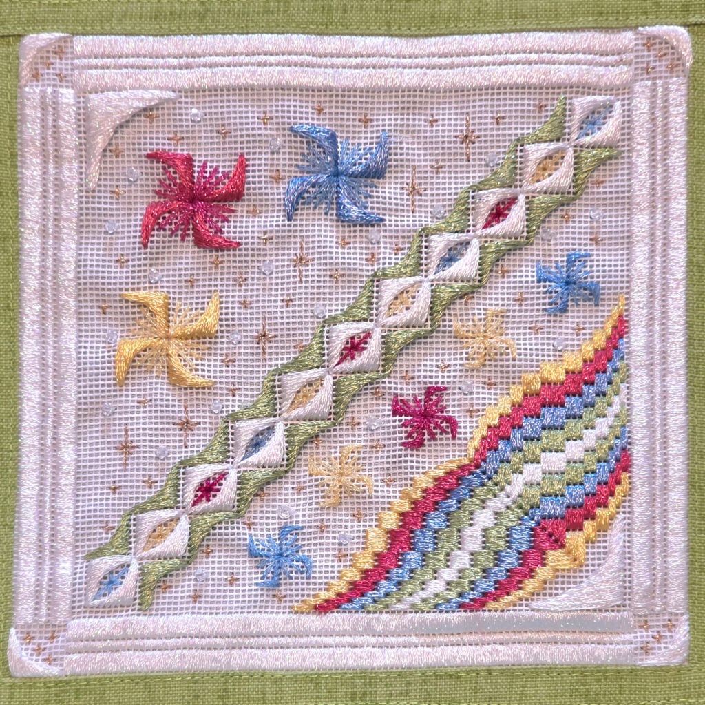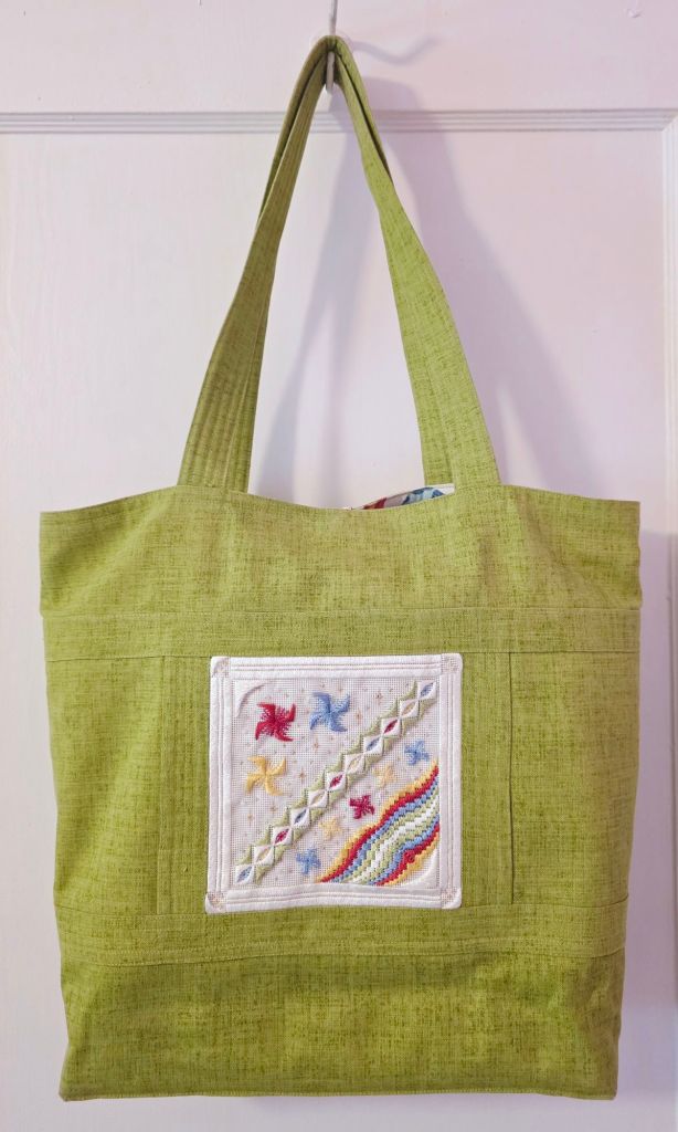 In 2014, I led the Chapter Book Project from 2013-2014, Jeannie’s Windmills by Pat Mazu for ANG Main Line Stitchers chapter and I never posted the finished bag.