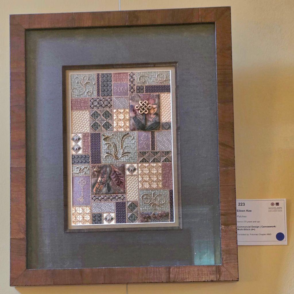 The winners were posted beforehand & I had to look. So, I knew Flowers Along a Rhode won Honorable Mention (410). Tag numbers are in parens. I sent it down with other members of New Jersey Needle Artists. Sorry if I missed someone but I count a total of 11 members who submitted 31 pieces and won 8 awards. They all looked great! I think you can spot mine in the first room you walk into (far right, 2nd down).
