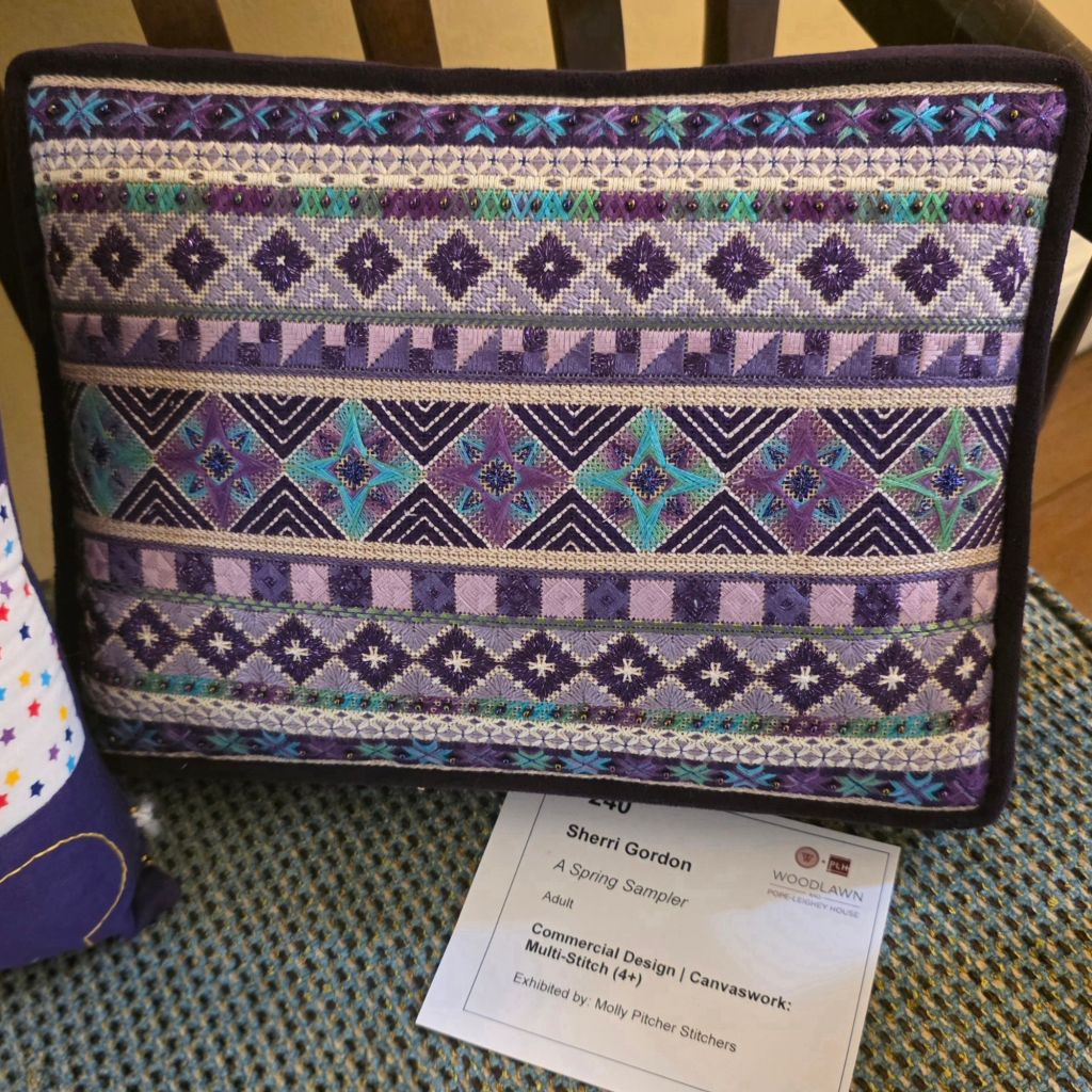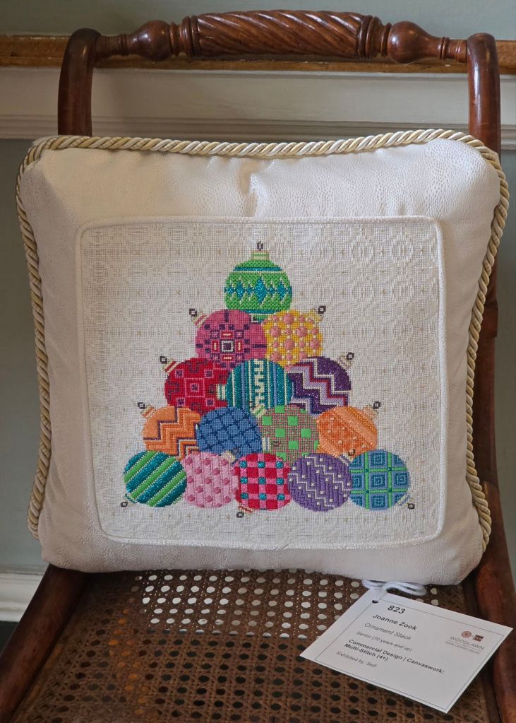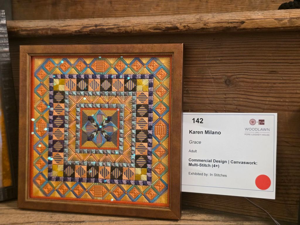 Also on the wall in the center, 2nd down is Noelle Drolles (141). This piece was featured in the ANG Needle Pointers magazine in July/August 2025. It’s a painted canvas called Small Window Box #1 designed by Jean Smith Designs. The Editor of NeedlePointers, Patty Walcott, also stitched it as one of the features, A Tale of Two Stitchers, written by Linda Mosch (also from NJNA). Congratulations Noelle on your Blue Ribbon!