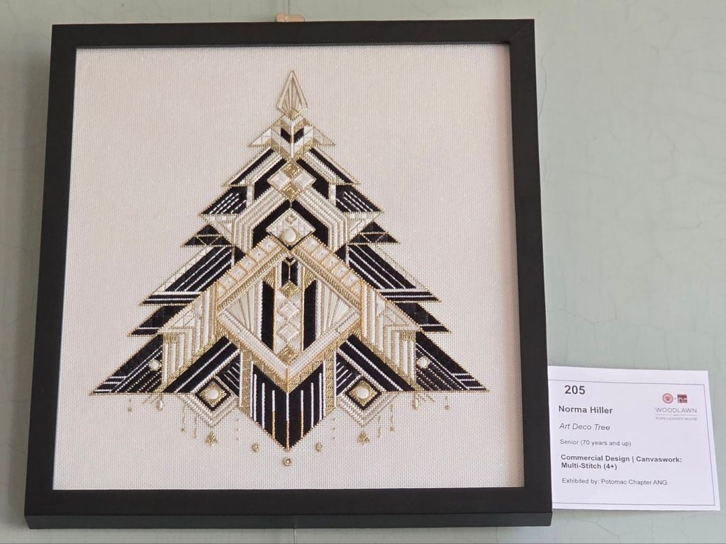 Speaking of Needle Pointers, there were 2 stitched Art Deco Trees. That was interpreted from a cross stitch pattern into canvaswork by Deborah Reichert, on the Editorial Staff of Needle Pointers for the November-December 2024 issue. The stitchers were Norma Hiller (205) and Eileen Kee (210). It’s so exciting to see pieces from the magazine being stitched!