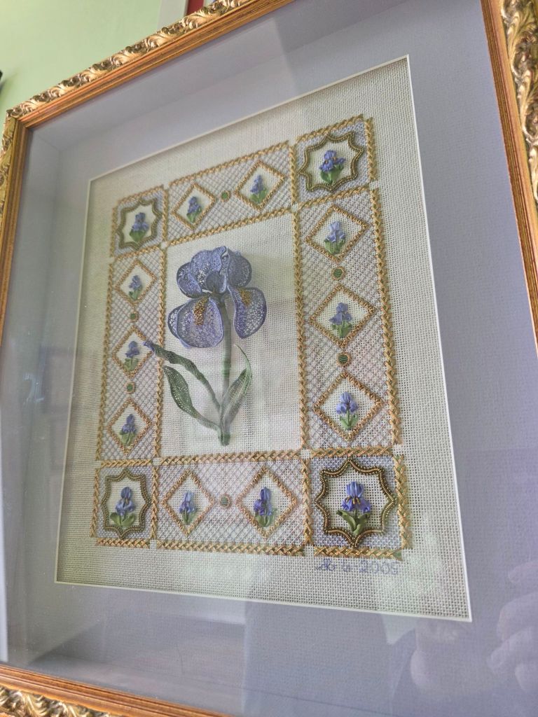 Nelly’s Needlers handled over 600 pieces for the show and baked 6,000 ginger cookies. One room upstairs held a non-judged exhibition from the Loudoun Sampler Guild and the ANG Northern Virginia Chapter. This one was my favorite in that room (a sunny room). It’s Stumpwork Iris designed by Michael Roberts.
