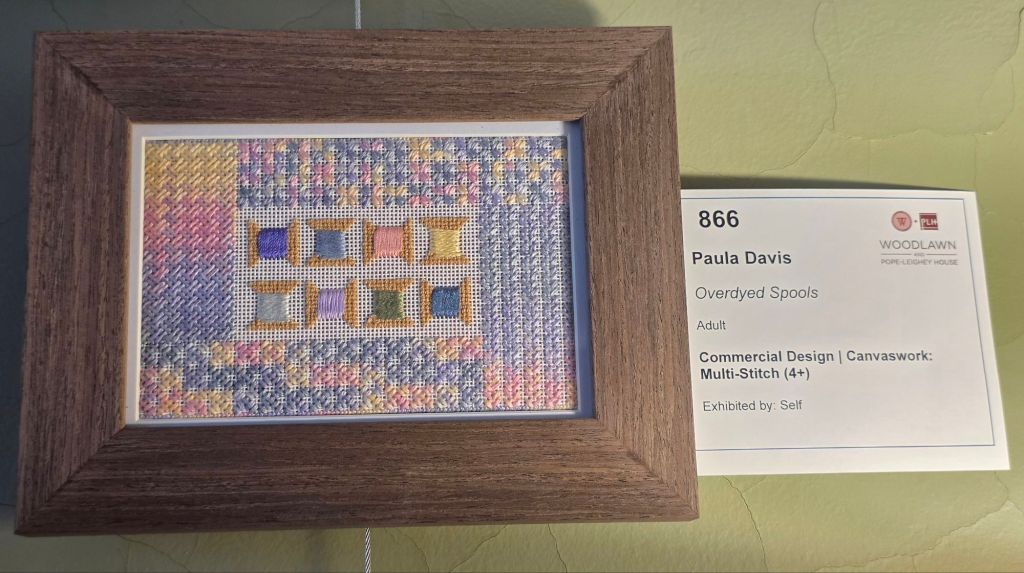 More exciting than seen pieces from Needle Pointers stitched is finding my designs stitched by others! I was double excited to find two of mine on exhibit. First, I saw Overdyed Spools (866) stitched by Paula Davis. This is an EGA Petite Project, free to all members. It’s also a free project for ANG Chapters through the 2017 Chapter Project Book. One skein of Watercolours is used, and the thread is manipulated to create the color flow in the upper left and lower right corners. She did really well.