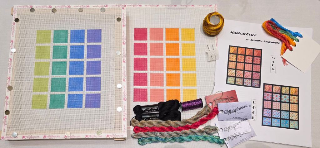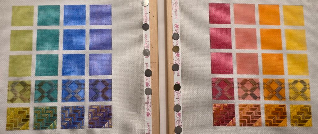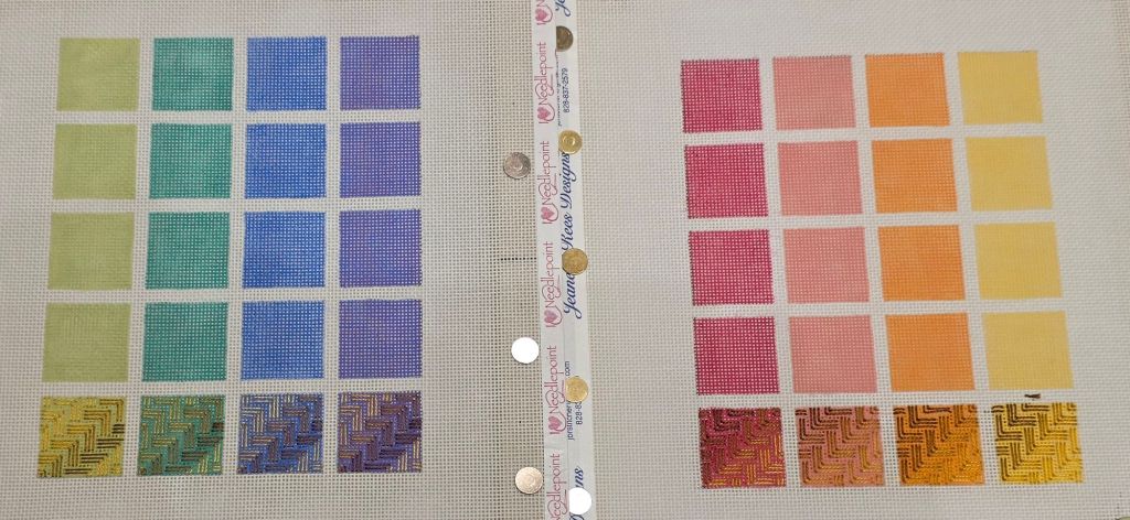 Kathy Rees sat next to me and she decided to stitch the warm colorway. So, I went with the cool colorway. That allowed us to see the color develop simultaneously across the color wheel of canvases that both create. Kathy makes as great a fellow student stitcher as she does a teacher.