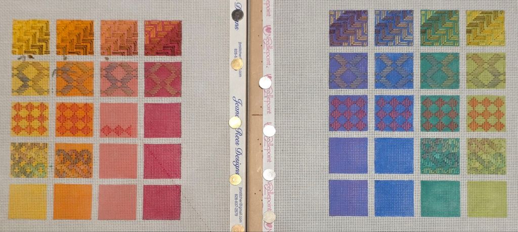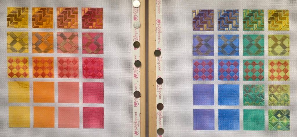 I got my 3rd row done on my warm canvas. I spent time color matching Waterlilies for the 5th row. By working with longer strands, I could complete a square but got a few knots that took time to loosen and only got one motif copleted on the 5th row.