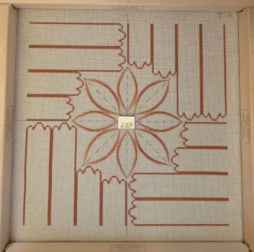 All ready for the next area. Linda M from Main Line Stitchers has finished hers ahead of us in order to walk us through the project over the next few months. The upright interior portion of the center area is the topic of tonight’s meeting along with progress 6 members have made on Songbirds, a painted canvas (each is different). Of course, we’ll have Show & Tell.