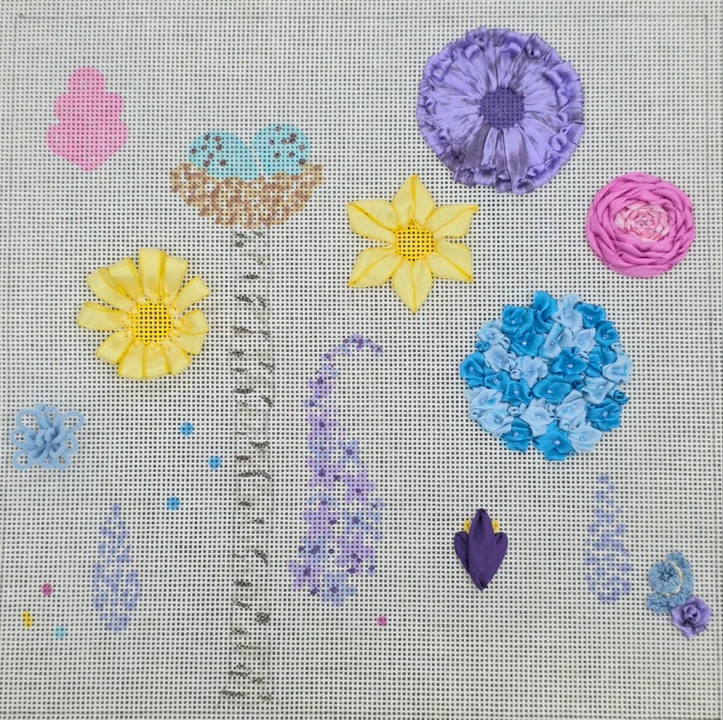 So, what does the canvas look like by the end of our 2 days? It looks like I’ll be doing 5 more big flowers, several small sequin ones, leaves, stems, a Birch tree, a nest, Robin’s eggs, and some background motifs. This will be fun.