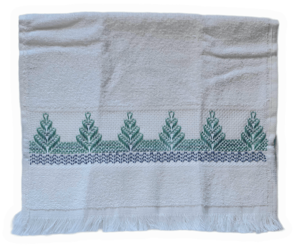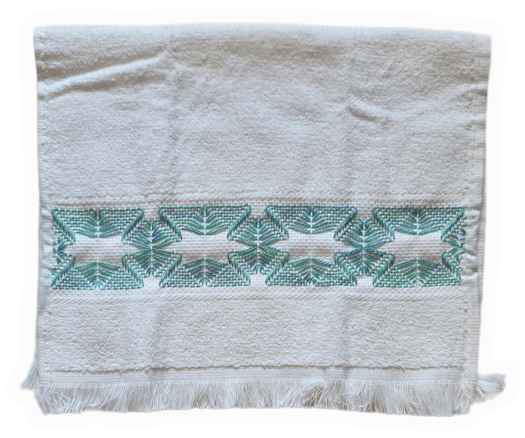 I did this pattern, Autumn Windbreak by Sue Meier, previosly using a red and blue Waterlilies but hadn’t left room for the bottom zigzag border. By counting better, the whole pattern just fits on the towel. To end the thread, I ran the needle and thread into the center of the edge where it’s folded for about an inch before bringing the needle out and cutting the thread. I like it better than running back through on the front. The pattern can be found on the Wayback Machine at https://web.archive.org/web/20090419090854if_/http://www.nordicneedle.com:80/newsletters/stash/10/autumn_windbreak_09_29.pdf