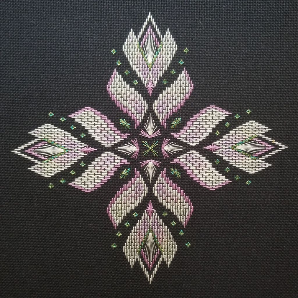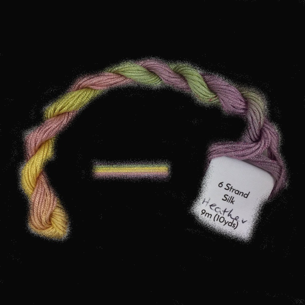 The chapter provided the Congress Cloth and threads, but I had enough of the lovely threads Ann-Marie sells on BeautifulStitches (.com.au) leftover from two previous projects based on Heather. A few people started stitching it last month in different colorways. It’s one of several free designs available on her website.