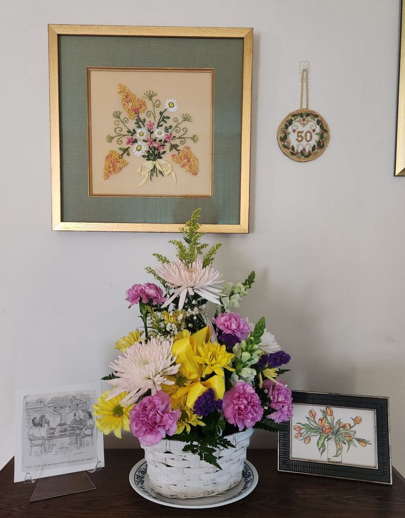It’s so light, and in this colorway, it looks more like a spring bouquet to me. So, working on it now is appropriate. We’re enjoying several spring bouquets, including a ribbonwork one, a painted one, and a fresh one.