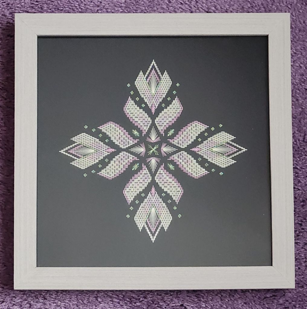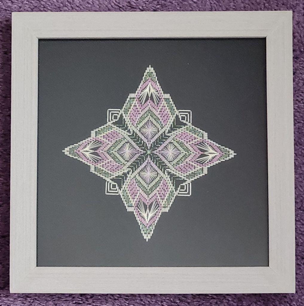 I realize I never posted Starburst by Patricia Hartman (from the 2013 Chapter Project Book that was an ANG Main Line Stitchers project) or Orchid Lady by Mary Knapp (an ANG Cyberpointers project from 2021) after they were framed at Repenning Fine Arts.