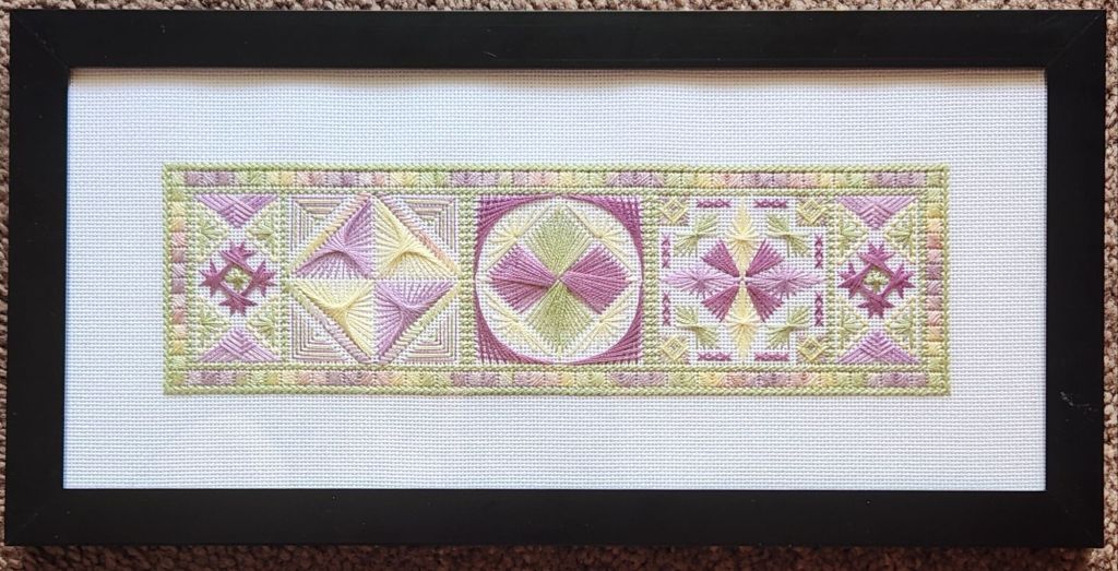 Summer Fireworks by Ann-Marie Anderson-Mayes was done on white Congress Cloth and placed in a 5″ x 11″ black frame (by me). I laced it to magazine board. Foam core would have been too thick. It came with plexiglass. I used it and still got a decent photo. The stitches are slightly raised but don’t look like they are getting squished.