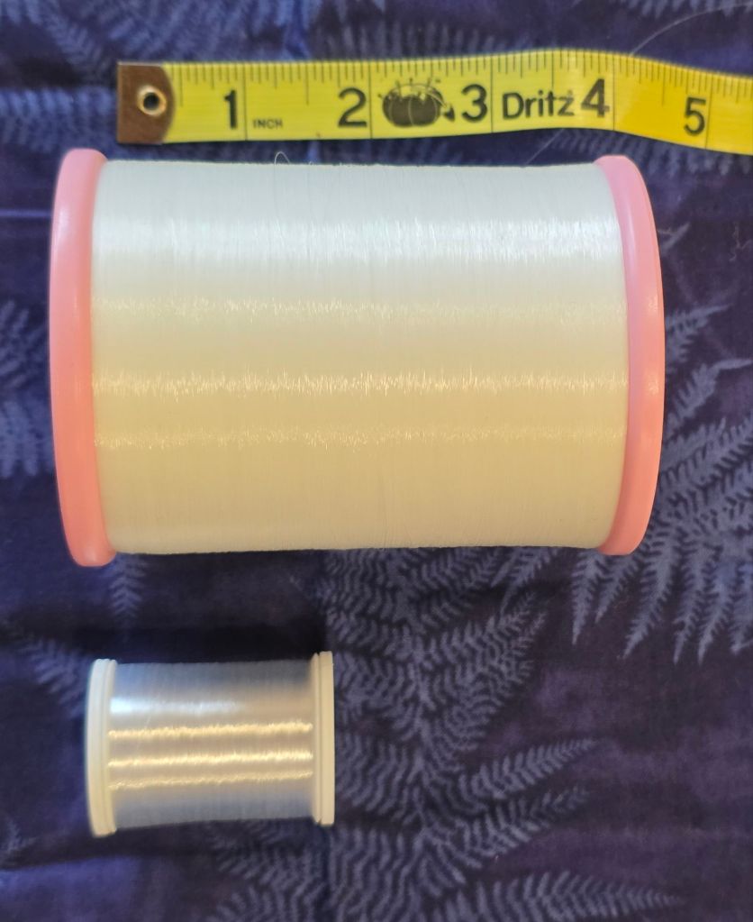 Besides the stitched piece and the piece of cork and Craftex that Sharon provided, scissors to cut canvas and any thread to attach the canvas to the Craftex is all that is needed (it won’t show). I brought a spool of white outdoor 100% poly thread by Coats & Clark. I also brought my lifetime spool of invisible thread but Janice M brought her spool of invisible thread that is big enough to be a lifetime supply for everyone in the chapter! I have never seen a spool so large.