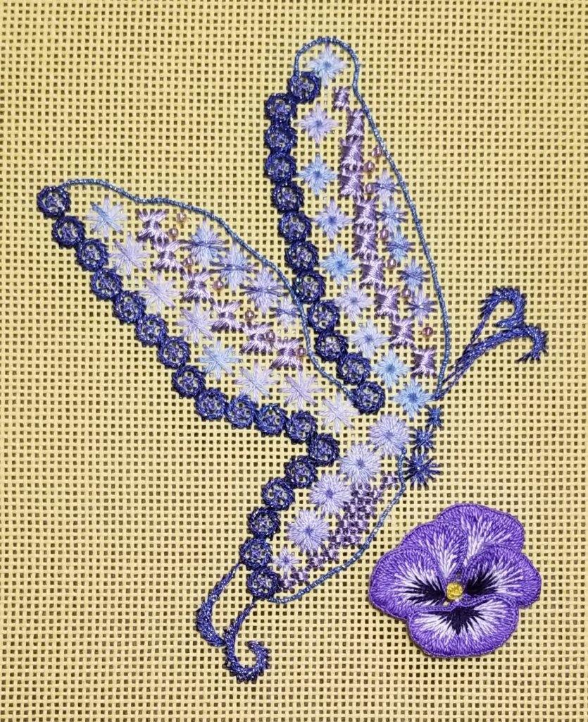 I wanted to showcase the Mauve Pansy that I stitched for the EGA class Rings on Her Fingers designed by Allison Cole and taught by Kay Stanis. Rather than making it into a ring, I selected Flutterby designed by Kurdy Biggs for ANG’s 2017 Chapter Project Book so that the butterfly would be flying around the pansy.