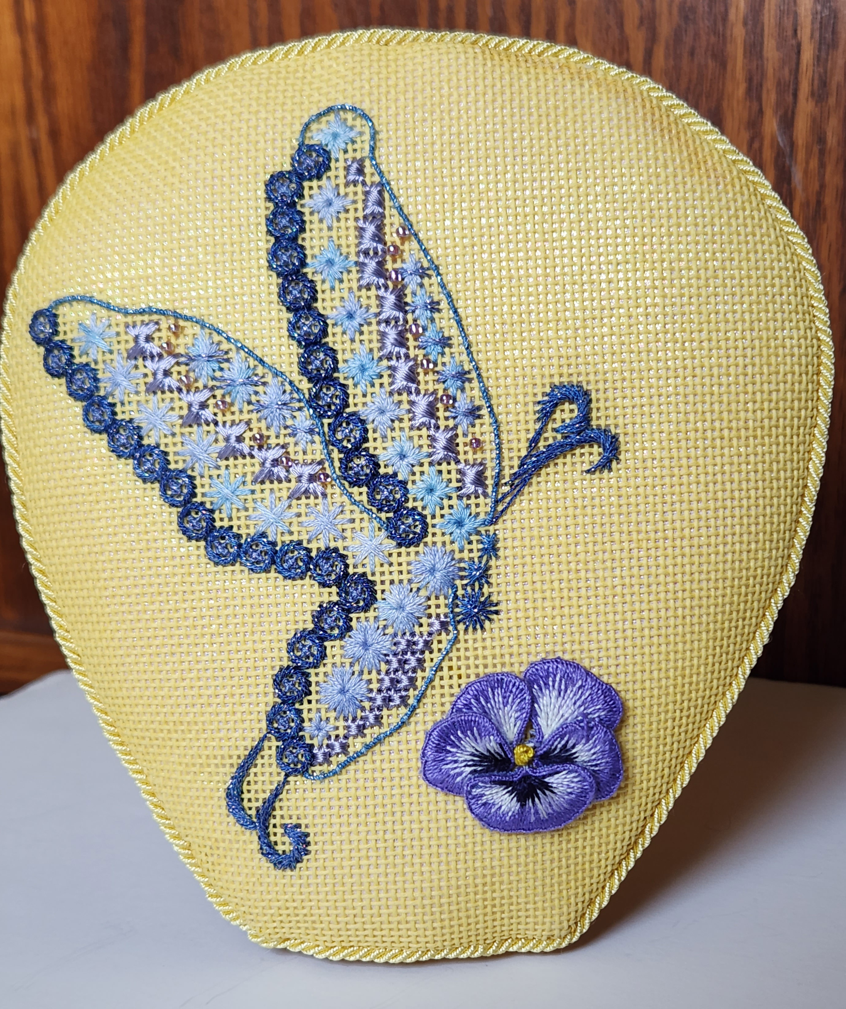 It’s been awhile with the finisher but worth the wait. The Mauve Pansy that I stitched for the EGA class Rings on Her Fingers designed by Allison Cole and taught by Kay Stanisis has Flutterby flying around it which is designed by Kurdy Biggs from ANG’s 2017 Chapter Project Book. There is an iridescent yellow lamé behind the canvas and an acrylic stand is inserted from the bottom.