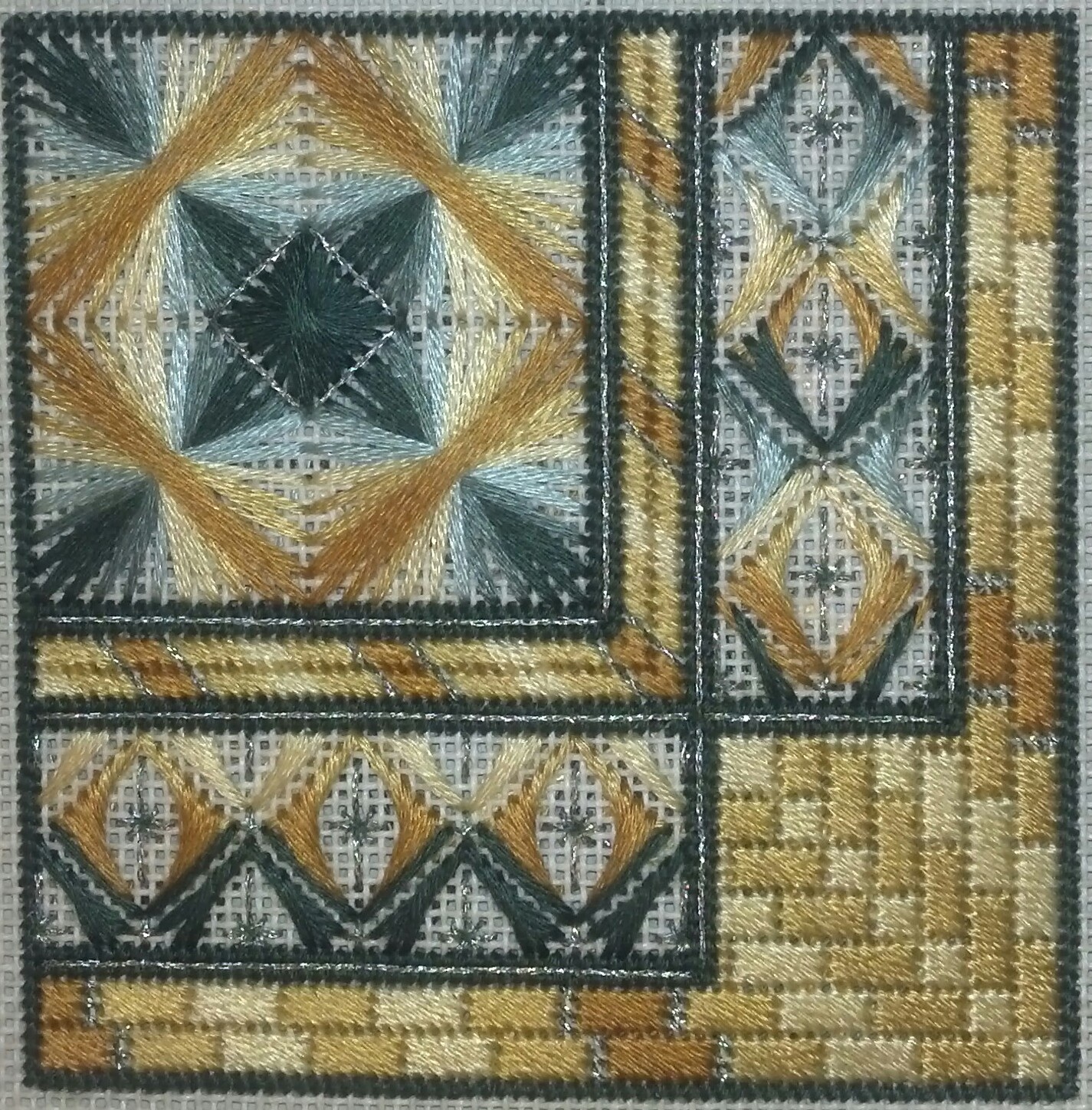 I used Jean Hilton’s Stimulating Stitches to put together a matching design to Pat Mazu’s Diamond in a Square which will go into a pair of bookends. Many of Jean Hilton stitches would work fantastic for this thread effect.