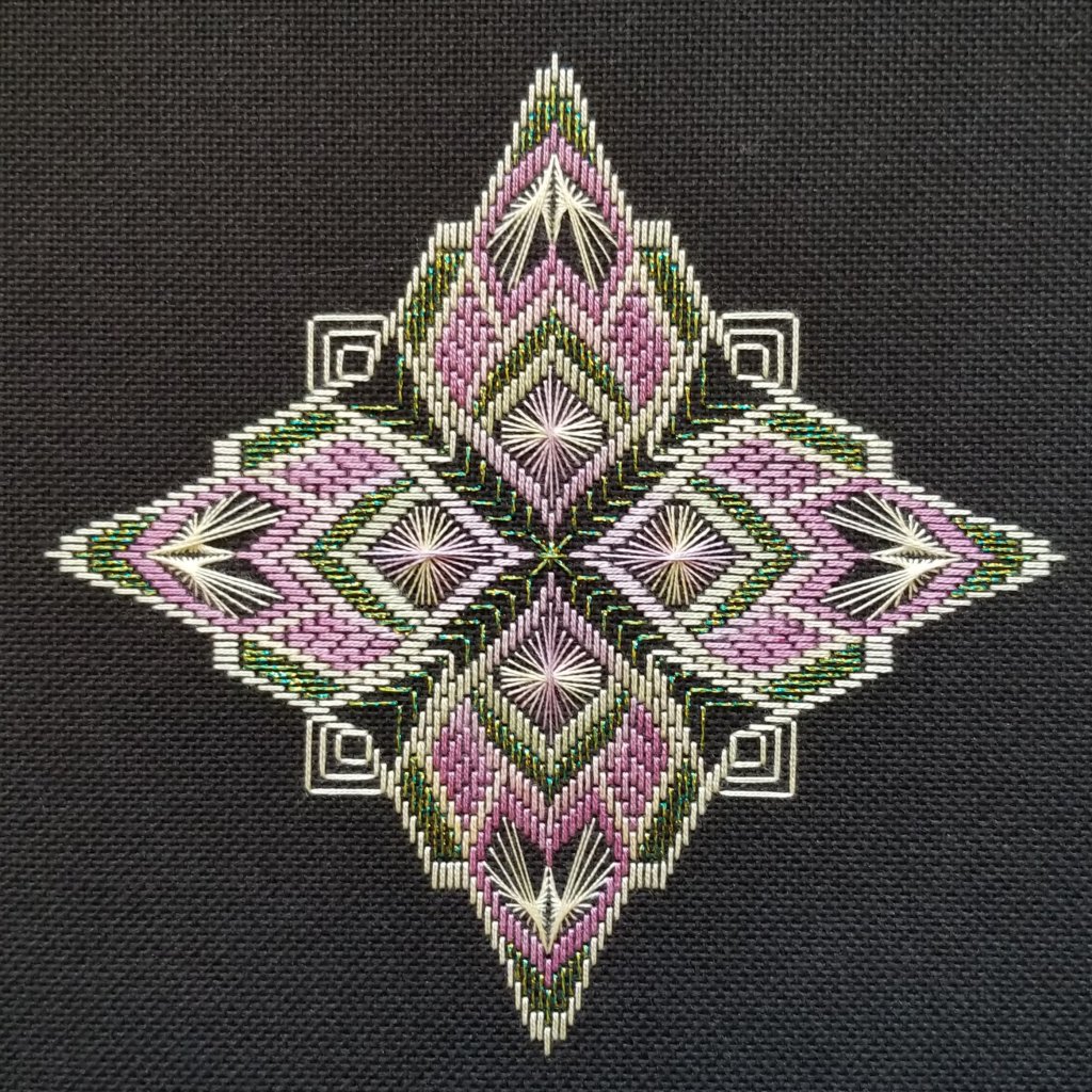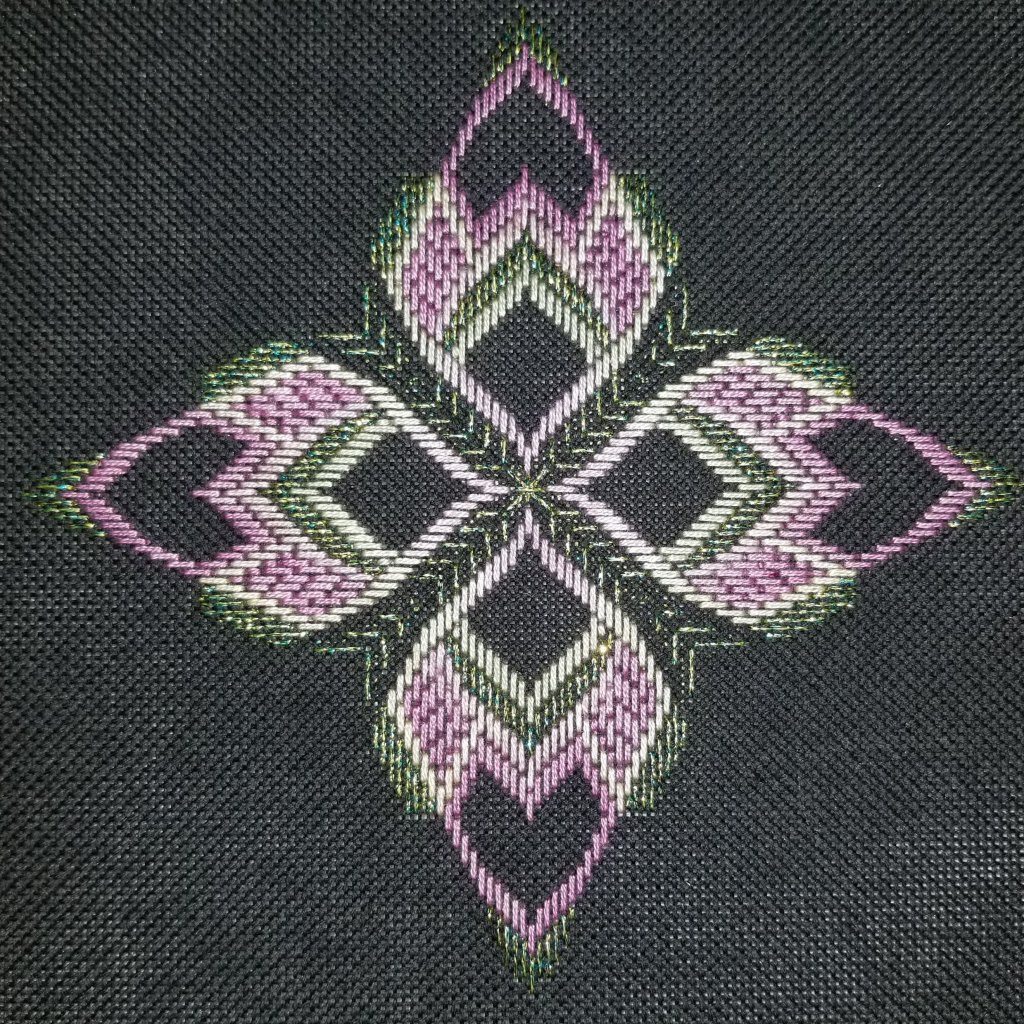 I really lucked out and the 36″ resulting length was ideal for completing the inner motif. And, I started the thread half on each side of the center so that the colors are symmetrical as they are worked outwards. And, it results in less wear and tear on the longer length of thread. I had to finish all four directions in order to be sure I stitched it in the same direction for a consistent color flow.