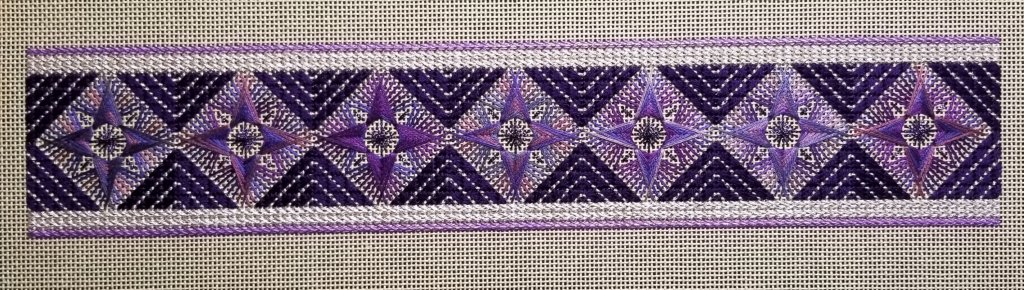 Bands 7 and 19 are both over 6 canvas threads using the key thread, an overdyed purple thread (Waterlilies 006 Amethyst). In order to see the pattern of the stitch, I used just 2 stands. These are both cross stitch patterns from The Encyclopedia of Canvas Embroidery Stitch Patterns by Katharine Ireys. Band 7 is Triple Cross Variation over 6 and Band 19 is Brazilian Variation over 6.