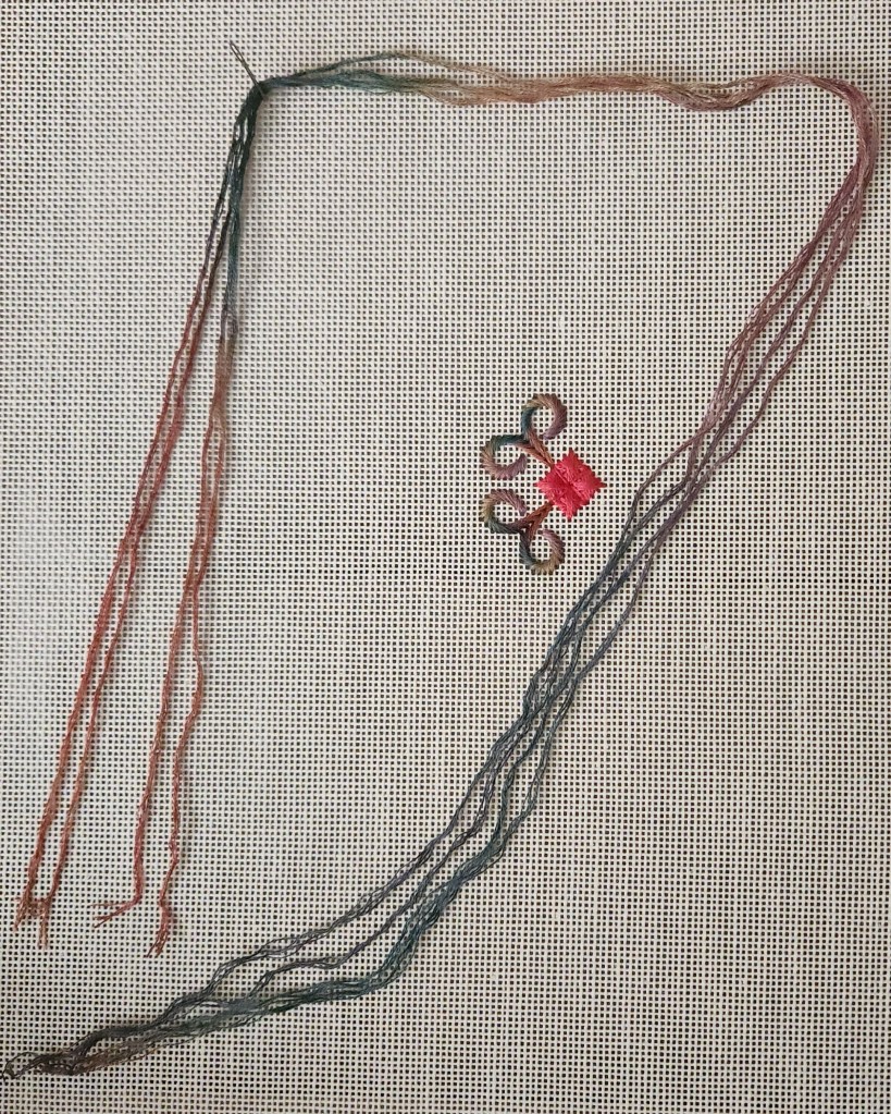 I cut the thread just where the shade close to the coral would start the crescents near the center solid diamond. The stretch of thread that follows offers a nice cross section from the skein of Rainforest.