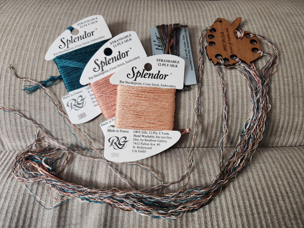 I liked the Waterlilies 168 Rainforest because it’s muted and selected the Color B (coral) thread, AVAS Soie d’alger 2921 Rouse Ancien, to brighten the Waterlilies and provide the contrast. One of the colors in Waterlilies looks like a shade of AVAS 2921 which means black would have been added to AVAS 2921. I didn’t want the exact match because that would wash out the crescents. In fact, Sue mentions that you do not have use any of the colors from the overdyed skein for Color B.