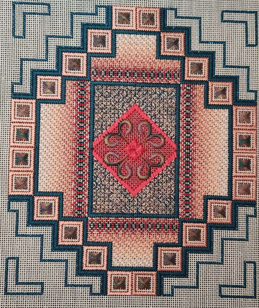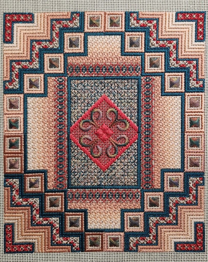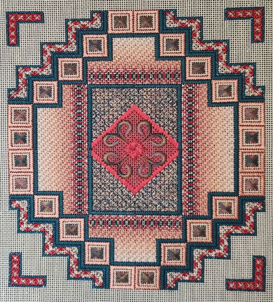 All the slanted gobelin stitches surrounding the Square Rhodes in the 4 quadrants are pointing to the center as well. So I wouldn’t forget the slant while talking at our Saturday Stitch-in, I had already started with the inner most over one stitch and the over 2 with Neon Rays in some of each quadrant. I did have to take my curling iron – a must when working with Neon Rays. But, no mistakes. Not a very exciting portion to stitch, but it was a rainy weekend here, and I finished it. Yes, the north, south, east, and west sides are purposely not closed in.
