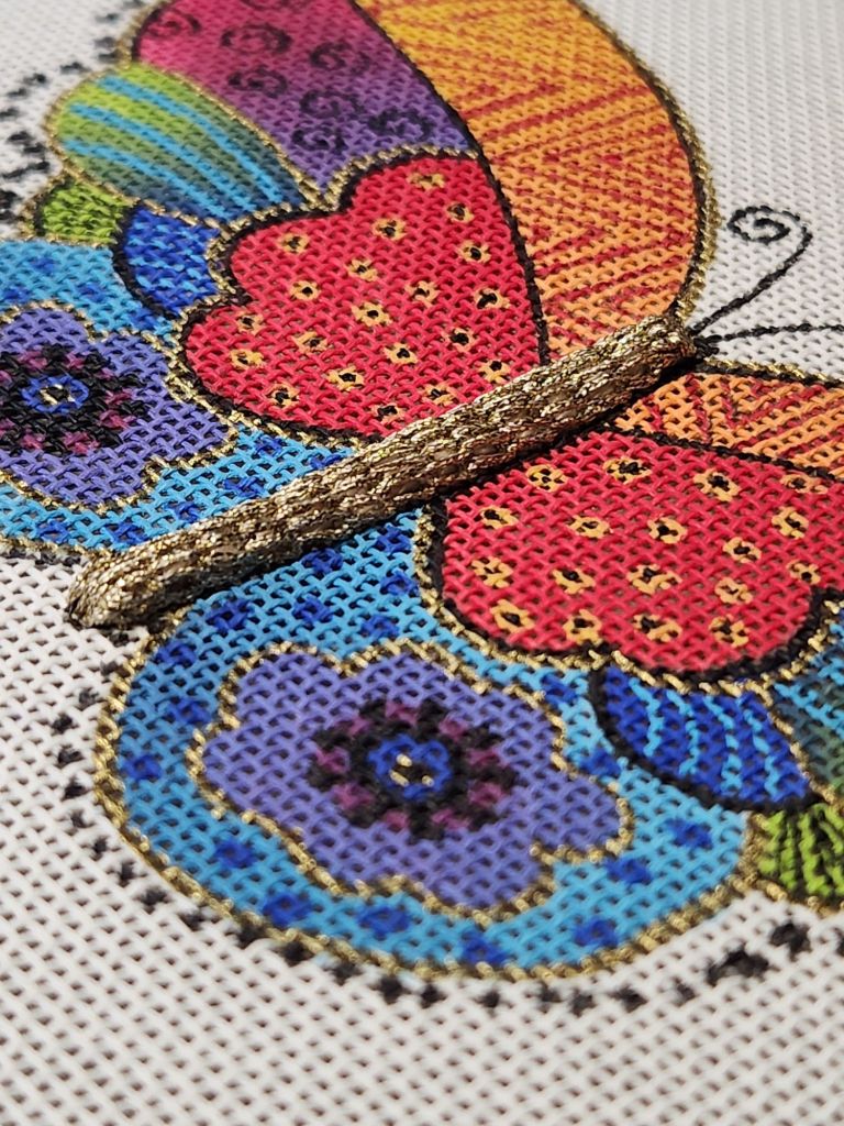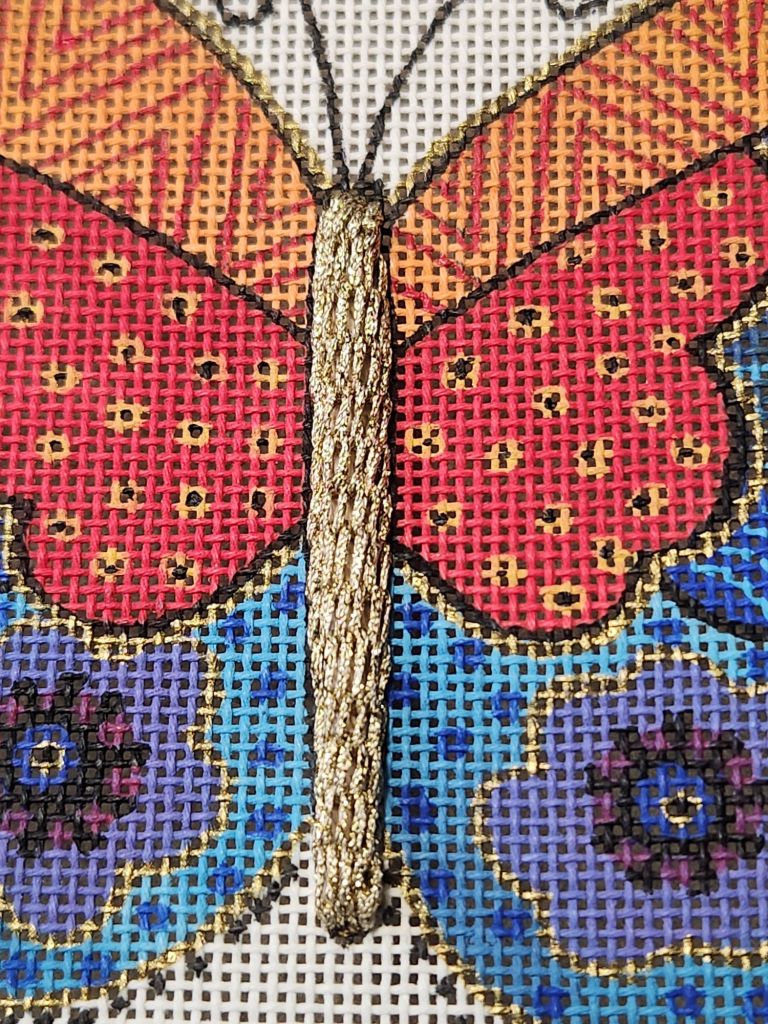 I think it’ll be fun to see what everyone suggests at chapter meetings especially since Linda and Kristen are our resident butterfly experts having worked on the larger Rainbow Butterflies Laurel Burch design by Danji (with Imagine written in the upper left corner). They used some threads and stitches from a Tony Minieri stitch guide and some of their own options.